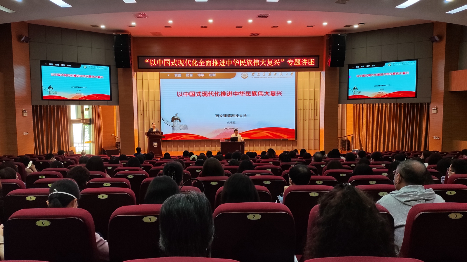 在长安校区教学楼JA111报告厅举办“以中国式现代化全面推进中华民族伟大复兴”专题讲座,讲座由西安建筑科技大学党委宣传部常务部部长高瑞龙主讲,学院党委书记单升军主持,全体教职工及学生党员、学生干部代表200余人参加。