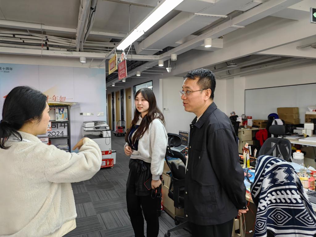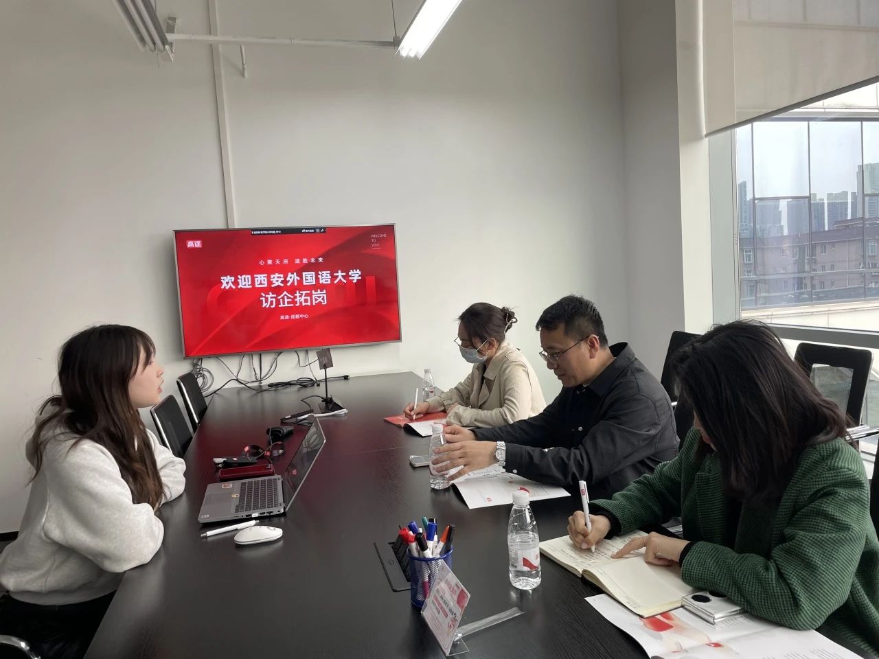 在成都锐拓传媒广告有限公司,行政部人事部负责人廖韩、行政人事主管何俊、胡静波热情迎接了工作组的到访。作为一家致力于协助各类优秀作品在世界各地的出版发行的企业,锐拓的版权业务遍及全球、涉及30多种语言,并连续多年开展对外文化交流活动。在双方洽谈中,负责人向工作组介绍了企业未来加大拓展海外业务的规划,表明了对外语类翻译、编辑、市场拓展等人才的需求,并表示愿意与学校开展更加紧密的合作,共同推动文化发展。