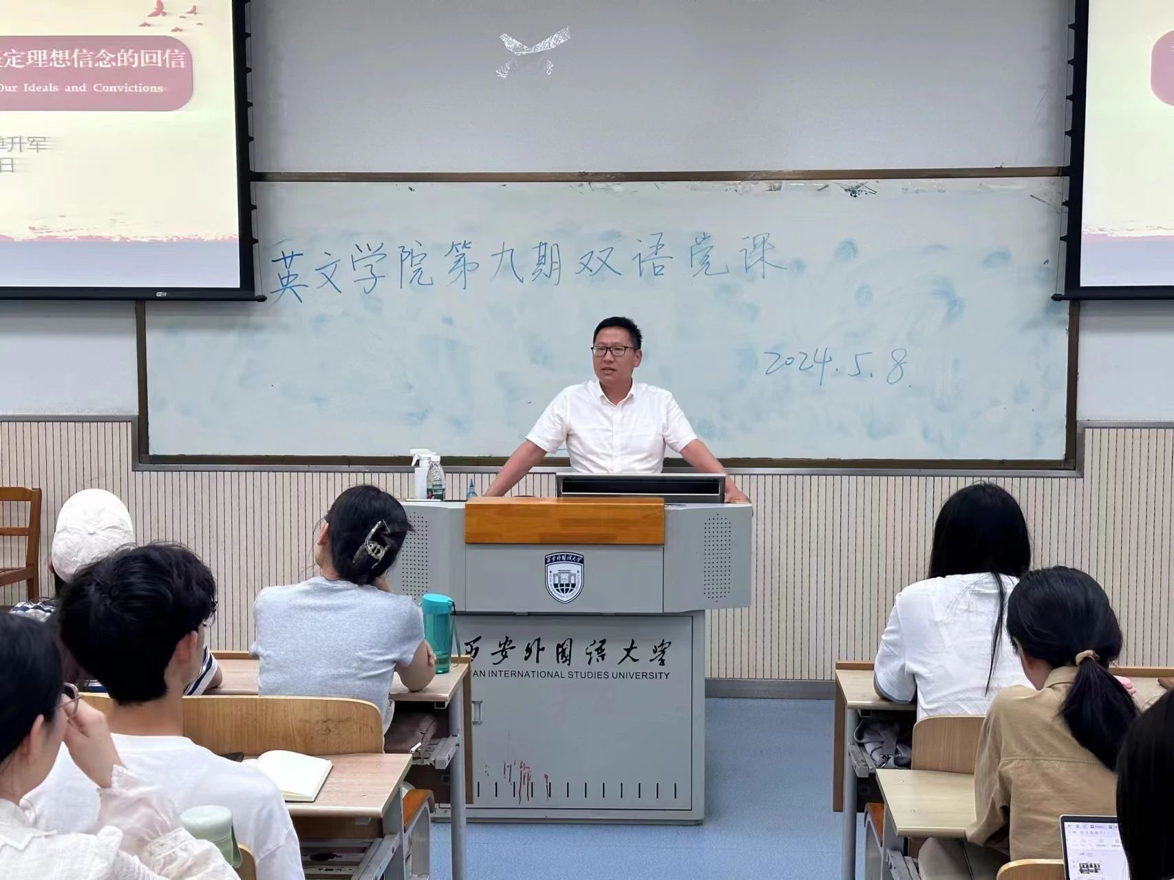 院长张凌主讲,他结合中英双语特色,系统全面地为同学们解读了习近平总书记给莫斯科大学中国留学生等三封回信,同时从科研学术的角度向广大青年党员提出指导性建议。他殷切希望同学们在日常学习中不仅要多读书、多思考、多钻研,还要树立崇高的职业理想,通过学有所成真正为社会和人民贡献自己的力量。