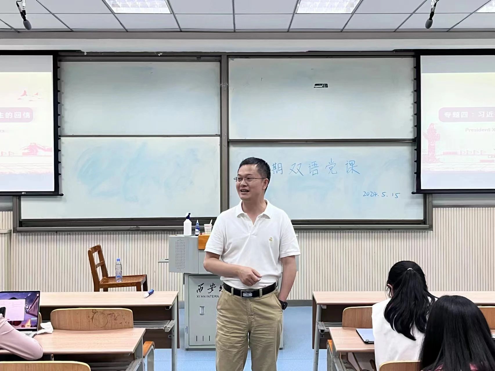 第三讲《习近平总书记关于青年大学生实践的回信》(President Xi’s reply to the practice of college students)由马克思主义学院教师许涛主讲。首先,许涛带领同学们重温了习近平总书记关于青年大学生实践的回信。接着以自身经验为引,从坚定理想和笃定信念两方面展开讲述。他提到,党的理想信念是中国共产党人的精神支柱,也是我们党永葆活力和战斗力的根本保障。坚定理想,笃定信念,是每一位党员必须时刻铭记的责任和使命。面对新时代的使命与任务,许涛呼吁青年党员相信和坚定理想信念,与祖国同行,为人民奉献。