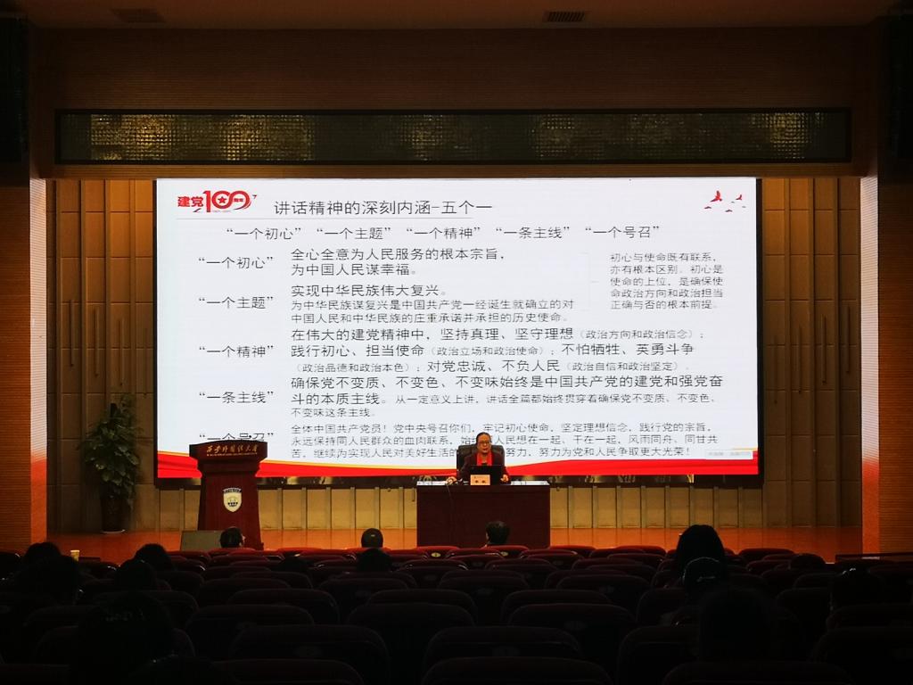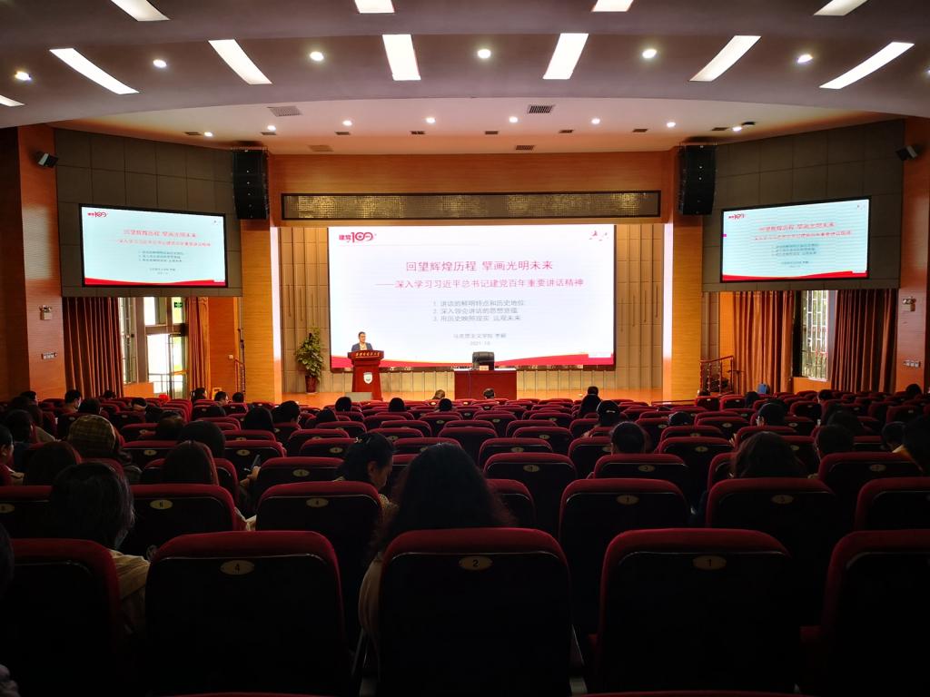 在长安校区JA111报告厅召开本学期第6次教职工政治理论学习会暨年度第10次党委理论学习中心组(扩大)学习会议,会议由党委书记单升军主持。邀请我校马克思主义学院李毅教授做了题为《回望辉煌历程,擘画光明未来——深入学习习近平总书记建党百年重要讲话精神》的报告,学院全体教职工参加学习。
