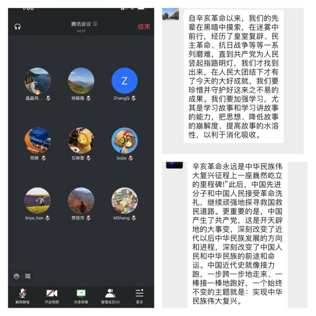 写作、视听说、基础英语与专业英语等7个教研室(支部)通过线上形式开展了本学期第7次政治理论集中学习。本次学习各教研室(支部)围绕着习近平总书记在陕西省榆林市考察的重要讲话、习近平总书记在纪念辛亥革命110周年大会上的讲话展开,同时,领悟习近平新时代中国特色社会主义思想“三进”工作与学院“三进”工作方案精神,并就以上内容进行交流研讨。