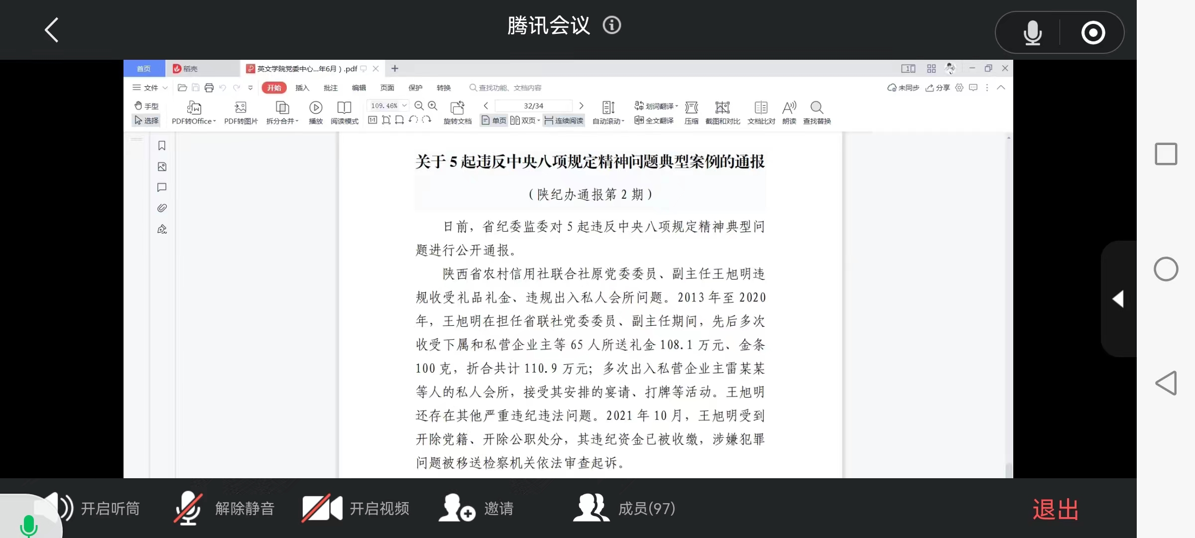 2022年6月15日下午,香香漫画 召开党委理论学习中心组第5期学习会暨教职工第15周政治理论学习会,组织开展党风廉政建设专题学习,中心组成员在教学楼G区209会议室参加,学院其他教职工在腾讯会议平台上学习,会议由党委副书记马文静主持。