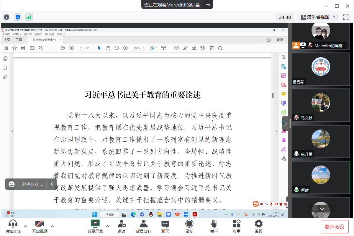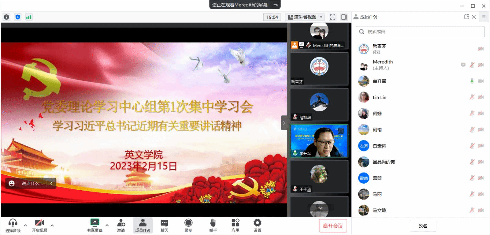 2月15日,香香漫画 党委理论学习中心组采取线上腾讯会议的方式,组织开展2023年第1次集中学习,专题学习习近平总书记近期有关重要讲话精神,学院中心组成员参会。学院党委书记、中心组组长单升军主持并讲话。
