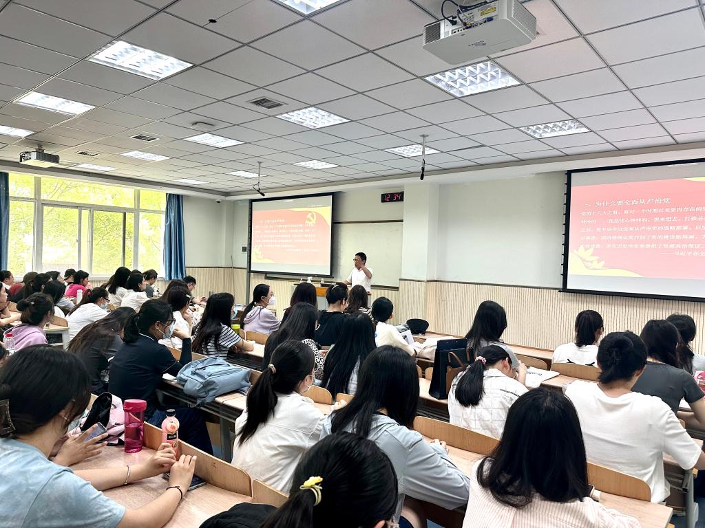 第一讲《全面从严治党》(Exercising full and rigorous self-governance of the Party),由学院党委书记单升军主讲,他以习近平总书记关于党的建设的重要思想为统领,从“为什么要全面从严治党”“什么是全面从严治党”“新时代全面从严治党有哪些要求和经验”“新征程上如何一刻不停地推进全面从严治党”等四个方面进行解读。他谈到,党中央作出全面从严治党的战略部署,以坚定决心、顽强意志加以推进,团结带领全党开创了党的建设新局面,为党和国家事业取得历史性成就提供了坚强政治保证。他提到,全面从严治党核心是加强党的领导,基础在全面,管全党、治全党,面向全体党员和党组织;关键在严,真管真严、敢管敢严、长管长严;要害在治,各级党组织都要肩负主体责任,各级纪委要担负起监督责任。他表示,新征程上就是要落实新时代党的建设总要求,健全全面从严治党体系,全面推进党的自我净化、自我完善、自我革新、自我提高,使我们党坚守初心使命,始终成为中国特色社会主义事业的坚强领导核心。最后,他寄语广大学生党员“青年当有志,立志在四方;祖国需要处,皆是我故乡”。