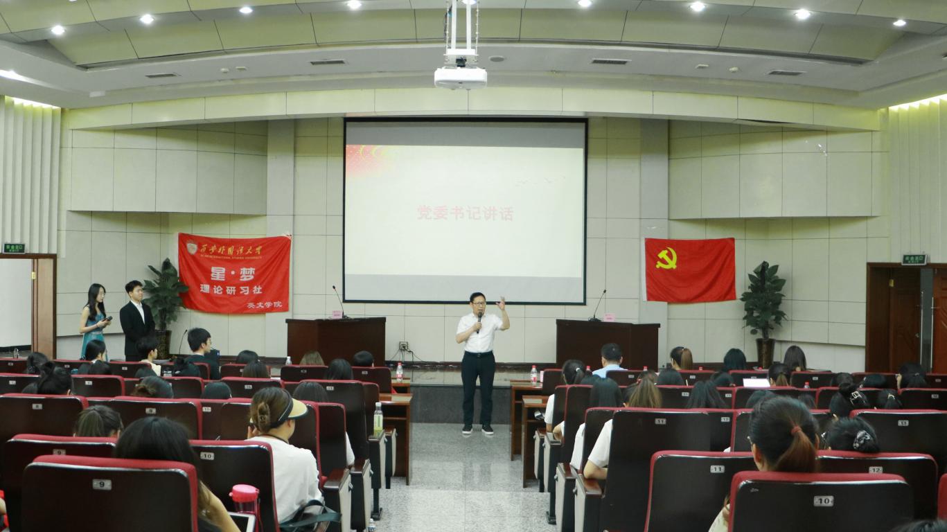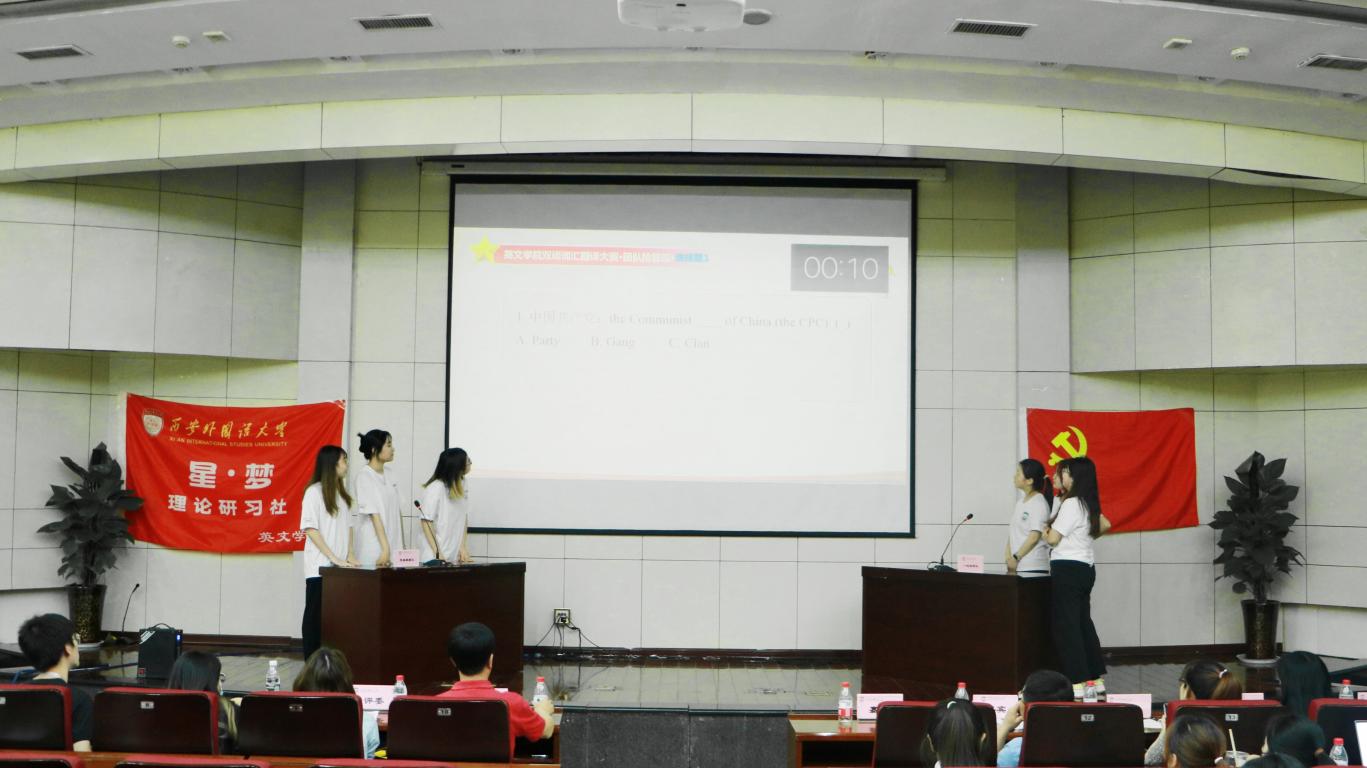 决赛包括团队抢答题和团队必答题两个环节。选手3人一队,参赛队伍两两上台对决,不仅考察了参赛选手的党史知识储备和英语专业水平,也锻炼了他们的小组协作能力和思维敏捷程度。大赛开始前,党委书记单升军讲话,他对全体参赛选手进入决赛表示祝贺,他指出本次比赛是同学们思想淬炼的宝贵机会,提出要用外语讲好中国故事,强调思想理论学习不是一朝一夕的事,全体学生要在日常多学习、多积累、多实践,将英语专业和党的理论知识紧密结合领悟实践。