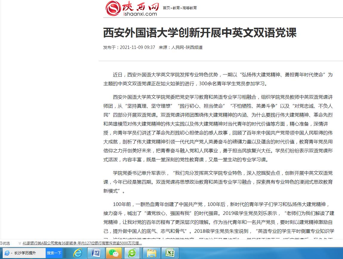 专业特色,深入挖掘契合点,创新开展中英文双语党课,今年已经是第四期。双语党课将思想政治教育和英语专业学习融合,探索具有专业特色的浸润式思政教育新模式”。