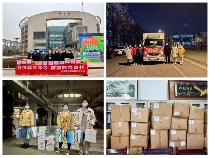 1月7日,西安爱尔眼科医院CEO陈志永、院办主任刘亚锋、屈光项目经营主任白强一行,向学院捐赠爱心物资(速食面)和防疫物资(酒精消毒物品)各20箱,用于支持学院一线疫情防控工作。1月11日,日照陕西商会募集善款,为学校捐赠抗疫物资,经校友协调专门为学院师生捐赠624箱(16袋装)纯牛奶。1月13日,日照陕西商会会长企业为学校捐赠抗疫物资,校友又协调专门为学院师生捐赠10万个口罩,用于后期防疫所需。企业和校友们的慷慨支持令人感动,为学院的疫情防控工作做出了积极贡献。
