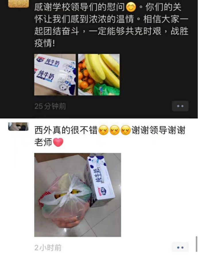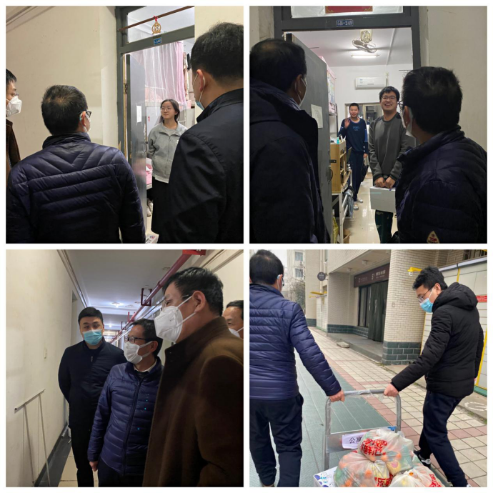 2021年12月31日,特殊的跨年夜,校长王启龙和纪委书记王强走访学院宿舍,慰问学生,让封闭在校的学生感受到了温暖和关爱。学院全体班子成员和2位教师党员志愿者进驻学生宿舍,与学生共同迎接新年,累计走访宿舍上百间,慰问学生达千余人,并给学生带去了新年祝福和“英文大礼包”。1月5日、6日,副校长姜亚军、教务处处长庞闻、学院领导及各年级专兼职辅导员一行前往隔离宿舍慰问学生,重点慰问了17间宿舍集中隔离C类或黄码学生,他们询问隔离学生的困难,叮嘱同学们在隔离的同时也要制定好学习计划,保证劳逸结合。