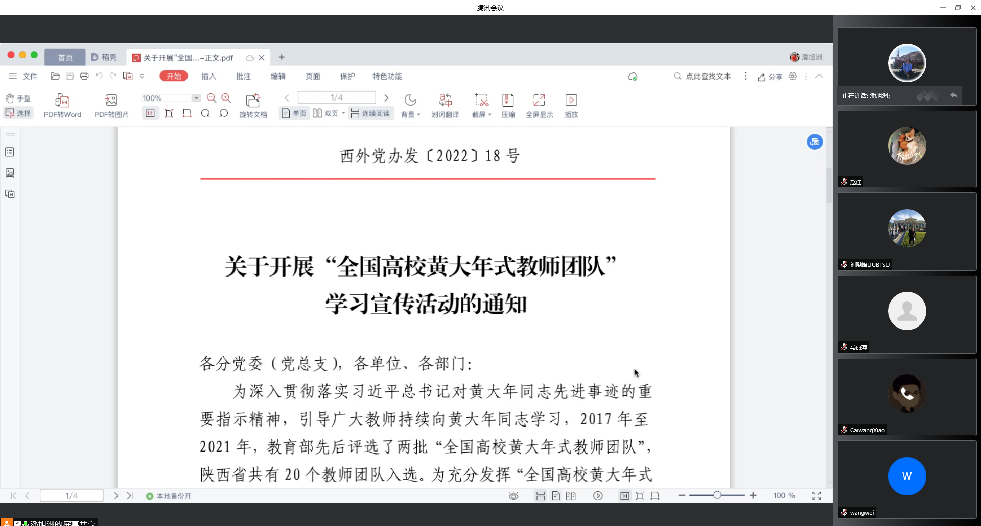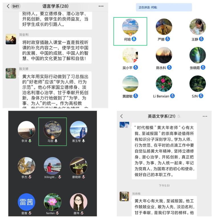 国别与跨文化研究系(支部)、英语文学系(支部)、翻译系(支部)、语言学系(支部)、写作教研室(支部)与大学英语教研室(支部)通过线上的方式,组织开展了本学期第8周政治理论学习暨学习“全国高校黄大年式教师团队”主题党日活动。