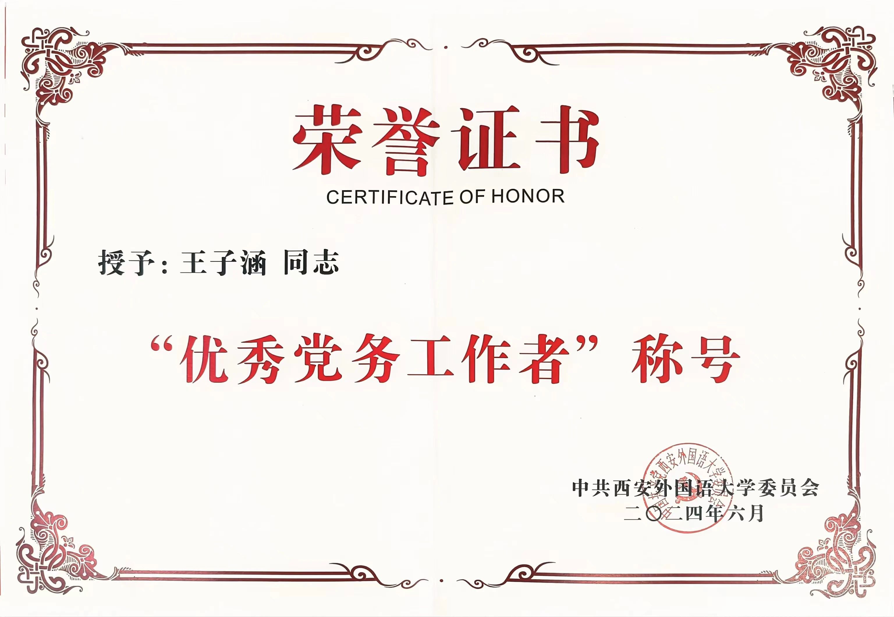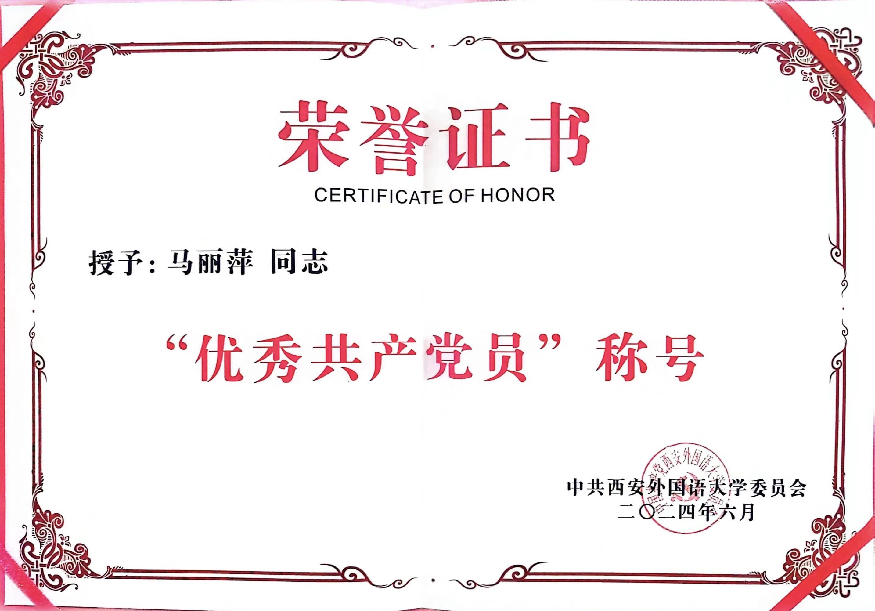 大会宣读了《关于表彰优秀共产党员、优秀党务工作者和先进基层党组织的决定》(西外党发〔2024〕23号),香香漫画 马丽萍老师荣获教职工“优秀共产党员”称号,王佳、林义壮、郭慧敏、潘岳恒4名同学荣获学生“优秀共产党员”称号,王子涵老师荣获“优秀党务工作者”称号。