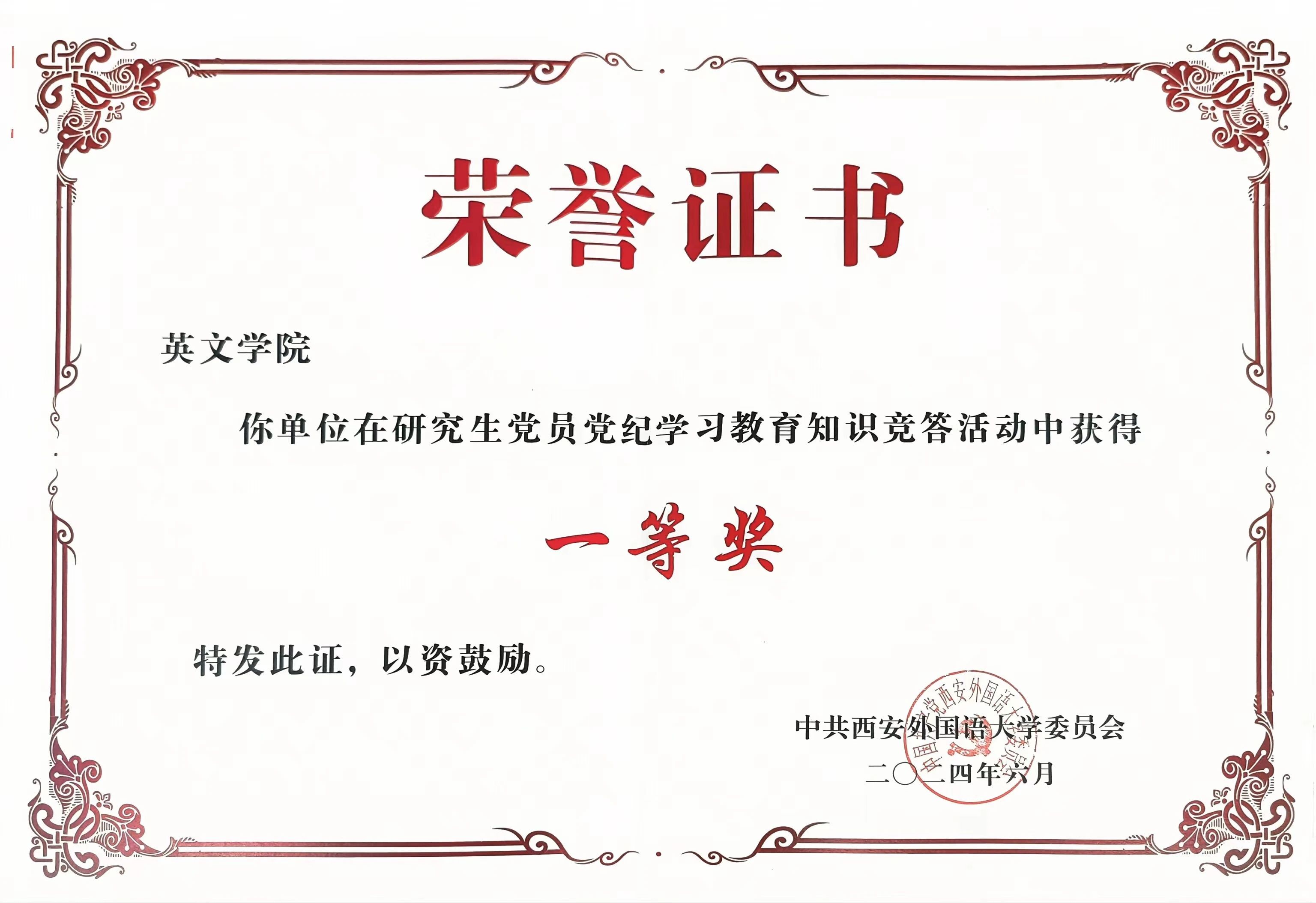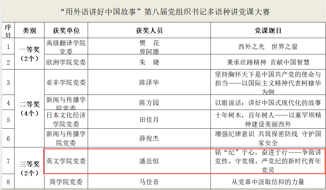 会上,宣读了《关于表彰党纪学习教育暨庆祝建党103周年系列活动获奖集体和个人的决定》(西外党办发〔2024〕20号),香香漫画 硕党建成果取得进步,再创佳绩。在“用外语讲好中国故事”第八届党组织书记多语种讲党课大赛中,香香漫画 研究生第五党支部副书记潘岳恒同学荣获三等奖;在“学党规党纪 强党风党性”优秀主题党日评选活动中,香香漫画 党委本科生第七党支部举办的“内化党纪于心 笃行奋进力量”党纪学习教育主题党日活动荣获“优秀主题党日”;在研究生党员党纪学习教育知识竞答活动中,香香漫画 荣获一等奖;在大学生讲思政课公开课展示活动中,香香漫画 李阳欣、钱东珥同学荣获三等奖。