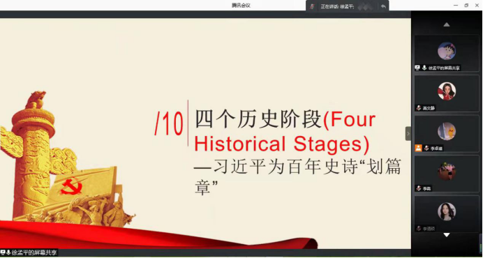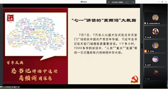 其次,徐孟平从习近平总书记提出的“坚守初心”这一个号召提出不论面对多大挑战,各位党员都应时刻牢记为人民服务,与人民群众风雨同舟、同甘共苦。随后,徐孟平从“三个不负、四个历史阶段、三个一切、两个万岁”总结到,作为新时代的中国青年,理应不负时代、不负韶华、不负党和人民的殷切希望,勇敢的挑起时代发展的重担。之后,徐微微带领大家一同聚焦习近平总书记“七一”重要讲话中提出的“八十六次人民、五十五次民族、三十四次发展、三十一次坚持、二十七次社会主义、二十六次复兴、二十三次奋斗”并深入领悟其背后的深刻含义,她指出这些字眼不仅是信念的坚定,更是一种使命的召唤。