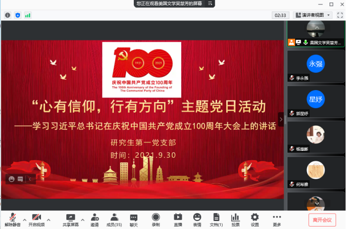 20217月1日,在庆祝中国共产党成立100周年大会上,习近平总书记发表的重要讲话引起了国内外广泛关注,进一步引导广大学生党员领悟讲话精神930晚上,香香漫画 研究生第一党支部通过腾讯会议,开展了以心有信仰,行有方向”为主题的党日活动会议由第五党小组组长吴慧芳主持。