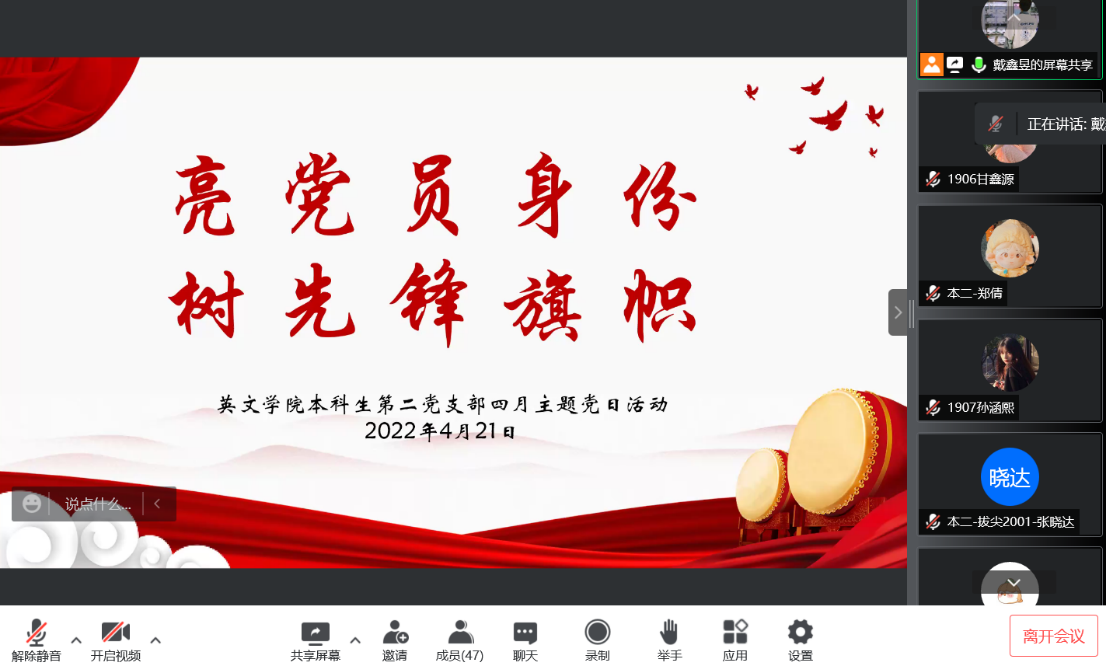 本科生第一党支部主题党日活动于4月24日线上举行,围绕“亮党员身份”“新时代青年使命”“青年不忘初心跟党走”“宿舍卫生、安全问题”四个维度进行集中学习,锤炼和加深了支部党员的党性修养。本科生第二党支部于4月21日召开主题党日活动,由线上学习会和线下党员宿舍挂牌活动两部分组成。支部书记高洋紧扣“入党为什么,在党干什么,身后留什么” 这一党员终其一生的灵魂叩问,围绕“亮党员身份”“新时代青年使命”“青年不忘初心跟党走”向全体同志介绍了成为党员后容易出现的问题以及如何自省并及时调整。本科生第三党支部于2022年4月22日在JA206开展本次主题党日活动,分为“开展最新理论学习”“公布党员宿舍”“颁发党员宿舍挂牌和总结”三部分。本科生第四党支部于4月24日中午召开本次主题党日活动,围绕“亮党员身份,树先锋旗帜”的诠释和党员心得分享两部分展开。研究生第五党支部于4月24日晚上线上召开本次主题党日活动,由组织委员刘杰主持。首先,刘杰带领大家一起学习了关于开展“亮身份、树旗帜、做表率”的文件,同大家一起领会文件精神。其次,刘杰强调了同美学们在日常生活中也应当做好表率,比如学习强国按时学习、按时打卡;每日疫情防控,及时向学院、学校汇报自己的状况。最后,许杉杉在总结中提到,作为党员,不仅要从理论上不断丰富自己,也要在行动上践行自己的初心和使命,发挥党员的模范带头作用,希望全体党员能够以身作则,严格要求自己,做好党员的表率作用。研究生第六党支部于4月24日在腾讯会议线上召开主题党日活动,由常二翠主持。第一部分开展“创建党员示范宿舍”评比活动,评比会实行严格的奖惩制度,要力争做到“五个一”,由小到大将党建工作从自己身边小事做起,进而影响带动他人。第二部分观看“感动中国十大人物”,希望全体党员同志向他们积极学习与看齐,肩负起时代赋予我们的责任,努力奋斗,做自己该做的,应做的,需做的。不负时代,不负人民,更不负自我,不负青春。