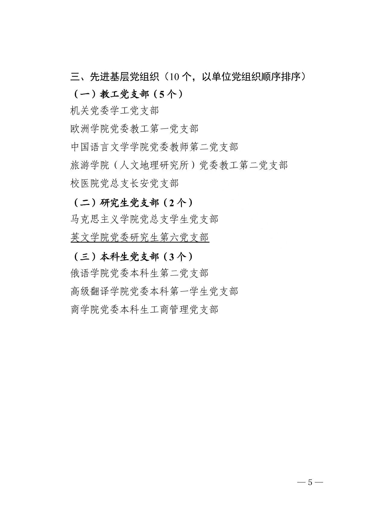 王满良老师荣获教职工“优秀共产党员”称号,牟子龙、李奕钦、张雨兰、冀婷等4名同学荣获学生“优秀共产党员”称号,李晶晶老师荣获“优秀党务工者”称号,研究生第六党支部荣获“先进基层党组织”称号,高洋老师获评第六届党组织书记讲党课大赛三等奖,研究生第五党支部:“亮党员身份,树先锋旗帜”主题党日活动获评第六届“优秀主题党日”,《习近平谈治国理政》多语种版本“三进”培根工程获批首批党建工作“一院一品”项目立项。在此,对获奖集体和个人表示热烈祝贺。