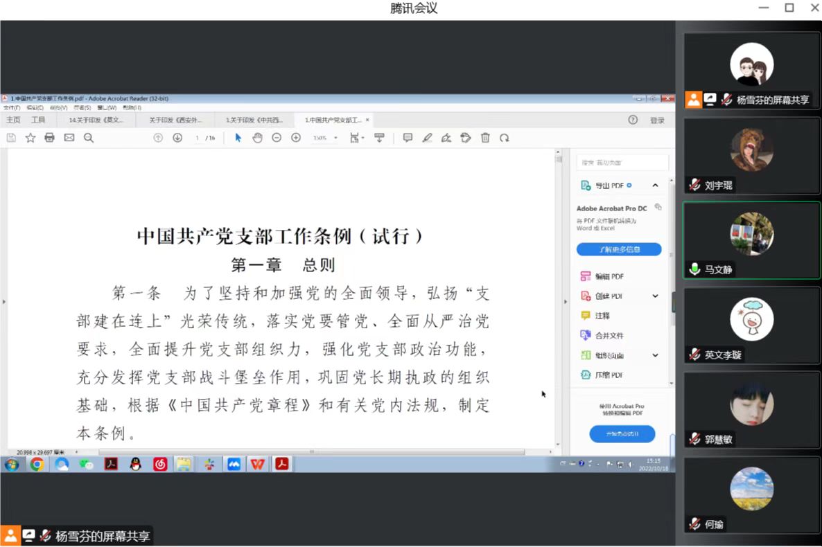 党支部标准化规范化建设标准》指标,进行了工作培训指导和安排部署。同时,领学了《中国共产党支部工作条例(试行)》,要求师生党支部书记要好好研读文件,严格党员管理,定期召开“三会一课”,在完成常规工作的同时,创新开展支部工作,打造样板党支部。