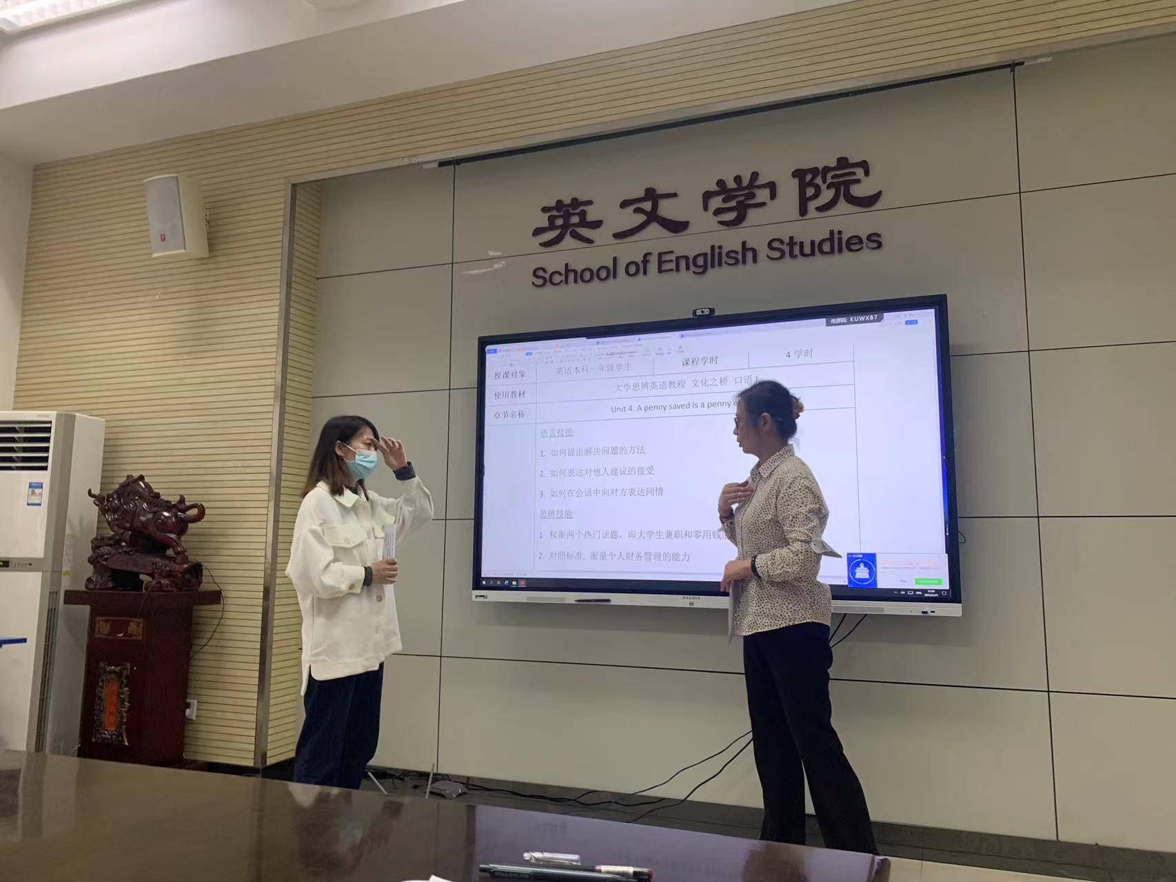 会议开始由王改燕教授领学习近平主持中央政治局第五次集体学习并发表重要讲话的部分内容,其次由王静副教授结合“课程思政大练兵”展示口译基础课程内容并分享参赛感想,王老师总结出课程思政应以课程特色为立足点,思政元素的挖掘需基于课程理论和设计的思路。随后,石琳霏博士、李海伦老师分别展示了各课程思政的授课内容及具体实施步骤,李毅老师根据两位老师展示内容,从课程思政切入点选取思路、课程设计逻辑、思政内容升华等方面一一做了精彩点评。
