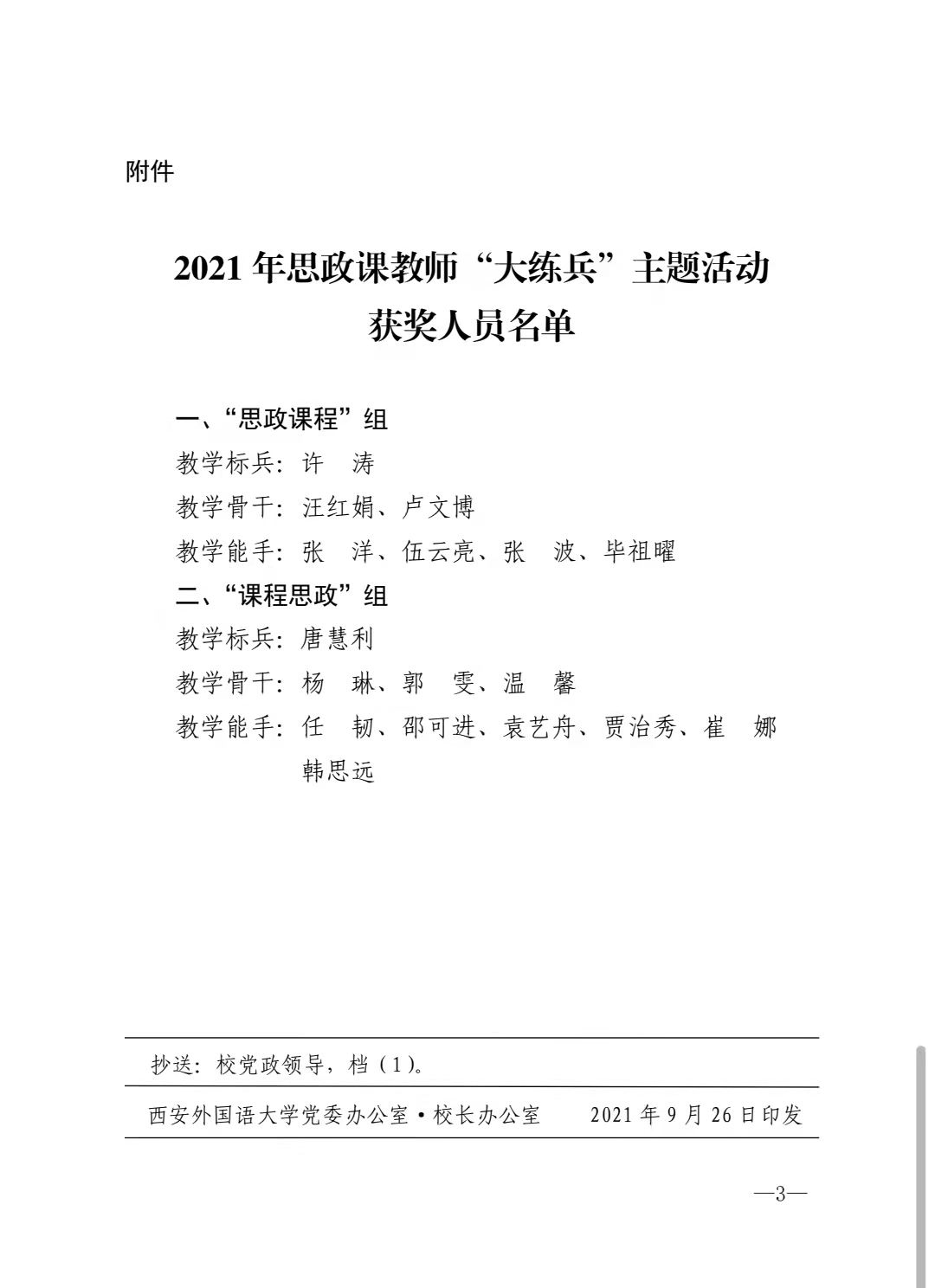 近日,学校下发《关于表彰2021年思政课教师“大练兵”主题活动获奖人员的通报》(西外党发〔2021〕77号),香香漫画 郭雯老师获得“课程思政”组“教学骨干”荣誉称号,邵可进老师获得“课程思政”组“教学能手”荣誉称号。在此表示热烈祝贺。