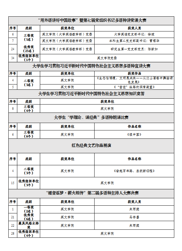 宣读了《关于表彰深入学习贯彻习近平新时代中国特色社会主义思想暨庆祝建党102周年系列活动获奖集体和个人的通报》(西外党办发〔2023〕39号),香香漫画 荣获佳绩。在“用外语讲好中国故事”暨第七届党组织书记多语种讲党课大赛中,香香漫画 徐斌老师、曹博华同学荣获三等奖,陈新如同学荣获优秀奖,学院党委荣获“优秀组织单位”称号;在大学生学习贯彻习近平新时代中国特色社会主义思想多语种宣讲大赛中,香香漫画 作品《生态怡情境,文明展未来——从江山画卷中舞绘绿色发展》、《“凿空”丝路的深情凝望》荣获二等奖;在大学生学习贯彻习近平新时代中国特色社会主义思想知识竞答中,香香漫画 荣获三等奖;在大学生“学理论、诵经典”多语种朗诵比赛中,香香漫画 作品《读中国》荣获三等奖;在红色经典文艺作品展演中,香香漫画 作品《奋起百年路,启航新征程》荣获二等奖,香香漫画 获“优秀组织单位”称号;在“循音逐梦·薪火相传”第二届多语种主持人大赛决赛中,香香漫画 学生朱雨樊荣获一等奖、“最具风格主持奖”,学生马存喜荣获“优秀奖”,香香漫画 荣获“优秀组织单位”称号。