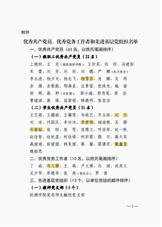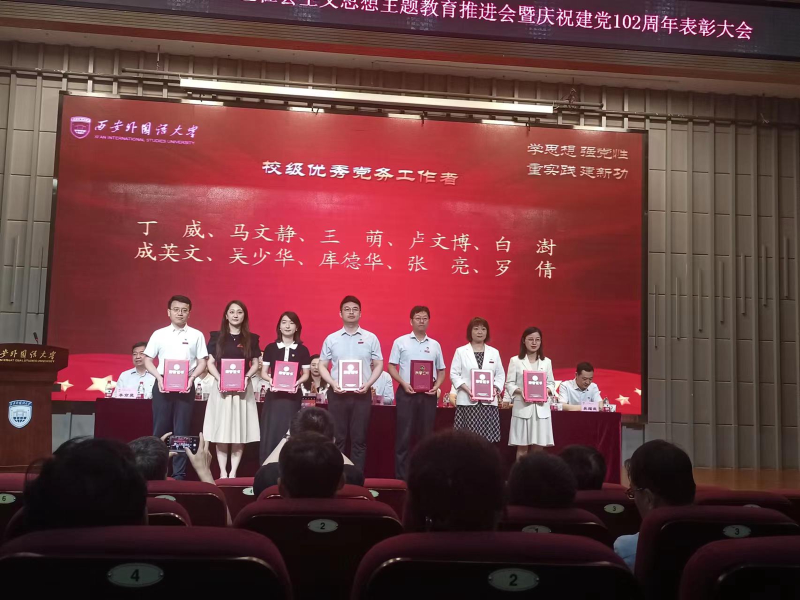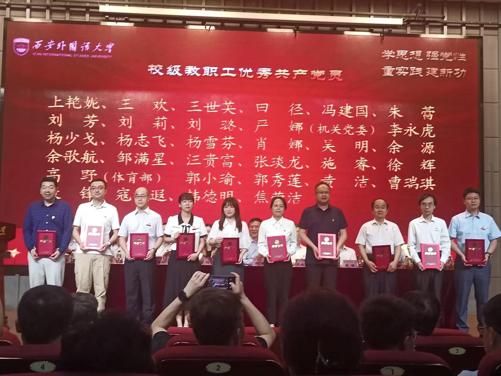 6月30日上午,我校在长安校区教学楼A111报告厅召开学习贯彻习近平新时代中国特色社会主义思想主题教育推进会暨庆祝建党102周年表彰大会。宣读了关于表彰优秀共产党员、优秀党务工作者和先进基层党组织的决定》(西外党发〔2023〕29号),香香漫画 杨雪芬老师荣获教职工“优秀共产党员”称号,刘杰、李梦翔、宋睿韬、戴鑫昱4名同学荣获学生“优秀共产党员”称号,马文静老师荣获“优秀党务工作者”称号。