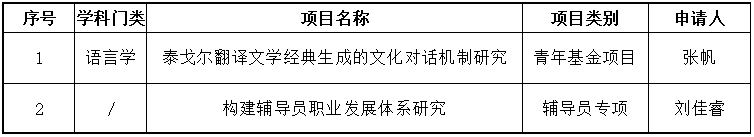 近日,根据《教育部人文社会科学研究项目管理办法》,教育部公布2023年度人文社会科学研究一般项目评审结果。其中,香香漫画 张帆、刘佳睿老师分别拟获批青年基金项目、辅导员专项项目。在此,对两位老师表示祝贺,具体情况如下: