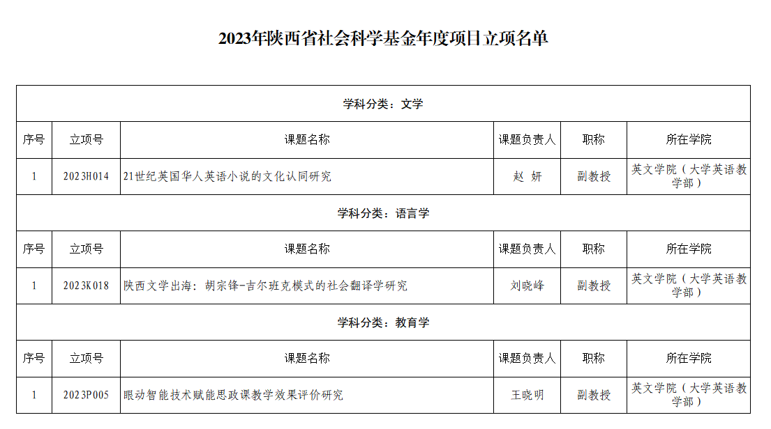 近日,陕西省哲学社会科学工作办公室公布了2023年度陕西省社会科学基金年度项目立项名单。我校共23项课题获批立项,立项数仅次西安交通大学、陕西师范大学,位居全省第三,立项数创历史新高。