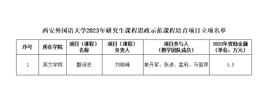近日,学校下发《关于批准2023年研究生课程思政示范课程培育项目的通知》(西外发〔2023〕132号)文件,公布香香漫画 2023年研究生课程思政示范课程培育项目立项名单,其中香香漫画 刘晓峰老师《翻译史》课程获批立项,在此对刘晓峰老师及其团队成员表示祝贺。