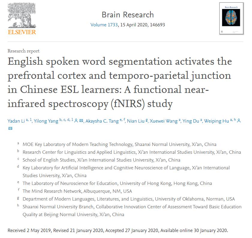 该论文是杨毅隆博士团队基于先前研究的最新进展。杨毅隆博士团队于2020年1月27日在Brain Research上发表了题为“English spoken word segmentation activates the prefrontal cortex and temporo-parietal junction in Chinese ESL learners: A functional near infrared spectroscopy (fNIRS) study”的研究论文,该文是我校与陕西师范大学、香港大学、美国俄克拉荷马大学等高校的合作研究成果,杨毅隆博士为论文通讯作者。Brain Research为医学大类、认知神经科学小类SCI来源检索期刊,2019年影响因子2.929,JCR二区。该论文初步确定了二语水平是影响二语语音词汇切分的重要因素,并且这一过程与大脑前额叶(PFC)和大脑颞顶联合区(TPJ)的激活密切相关。