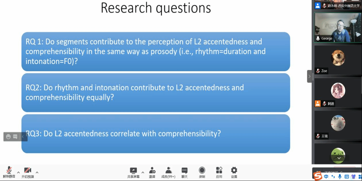 接着,杨春生教授提出问题:外国口音是否重要?他认为,口音不仅会影响言语可理解度,也会影响说话人在社会中的身份构建。杨教授分析了影响二语可理解性的因素,以及音段与韵律在影响二语可理解性中的角色,从而透析该领域目前研究空缺及不足。由此,杨教授提出三个研究问题:(1)音段是否同韵律一样,以同样的方式影响二语口音与可理解度?(2)节奏(时长)与语调(F0)对二语口音和可理解度的贡献是否相同?(3)二语口音是否与可理解度相关?基于以上问题,杨教授通过实证性研究,用PrattR package等研究工具,对所收集语料进行分析。研究表明:(1)母语者在言语可理解度与口音分辨中,更容易依赖音段特征,而非语调与节奏;(2)中文母语者在言语可理解度与口音分辨中,更倾向凭借语调特征,而非节奏;(3)汉语二语的言语口音与可理解度显著相关。随后,杨春生教授进一步对研究进行深入讨论,并对该领域未来研究方向及教学影响做了展望,极具启发意义。