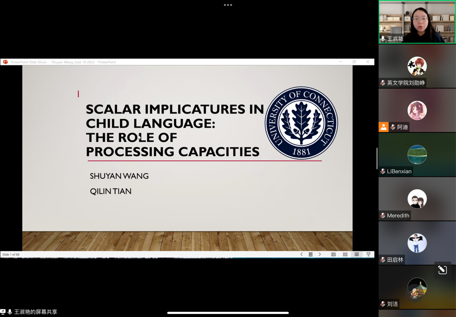 讲座围绕孩童语言中的等级含义推理展开。讲座通过对四个实验及其结果的解读,从语言处理能力对等级含义推理的影响,启动研究及记忆负荷研究三个方面展开讨论。讲座伊始,王淑艳就等级含义对与会师生进行了详细的解释。王淑艳表示,在交际中,说话者想要表达的含义并不总和话语表面上的意思相同,存在等级含义。现有研究并未涉及孩童语言处理能力限制在其处理等级含义时的作用。因此,本场讲座将聚焦于解答孩童等级含义困难是否与孩童语言处理能力不足有关的问题。