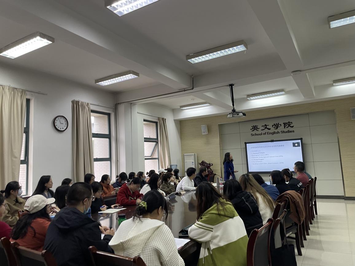 芮教授的讲座围绕“文学社会学概述”、“文学社会学研究问题、研究方法”、“文学社会学跨学科研究的发展和相关理论”、“卡萨诺娃的世界文学研究及英格利希的文学经济学研究”这四个方面展开。