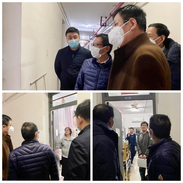 院长南健翀、党委书记单升军、党委副书记马文静及各年级专兼职辅导员一行前往隔离宿舍慰问学生,重点慰问了17间宿舍集中隔离C类或黄码学生。
