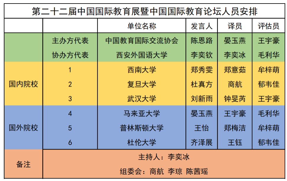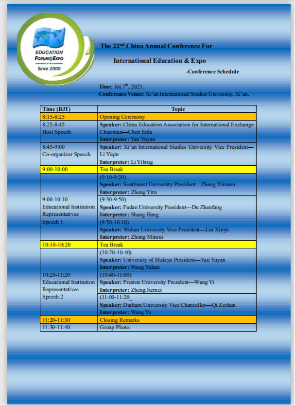 代表(协办方)分别模拟致辞,对会议进行介绍并提出对中国国际教育的展望。在研讨会中,三所国内院校代表及三所国外院校的代表分别对各自学校进行了全面的介绍。最后主持人在闭幕式中对会议进行总结,并提出展望。
