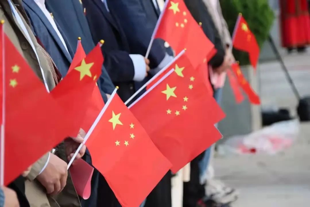 清晨七点,升旗仪式正式开始。升国旗,奏国歌。五星红旗在中华人民共和国国歌声中缓缓升起,全体人员庄严肃穆,齐唱国歌,行注目礼。