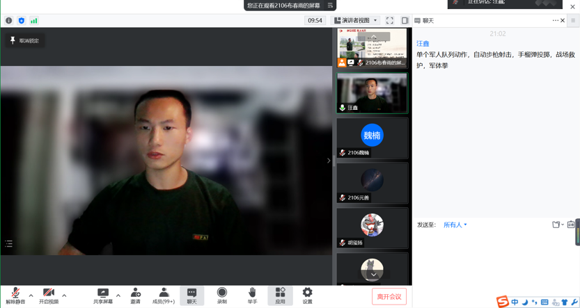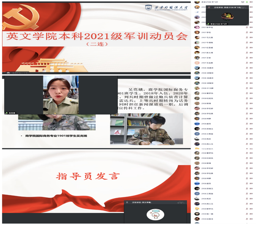 召开2021级军训动员大会暨教官见面会。一连指导员刘喆、连长汪鑫、二连指导员李璇、连长吴亮娥、三连指导员杨雪芬、连长田侠灵、四连指导员侯思言、连长朱朝阳以及2021级全体学生参加会议,由于疫情防控要求,会议通过线上形式召开,会议由各连队指导员主持。