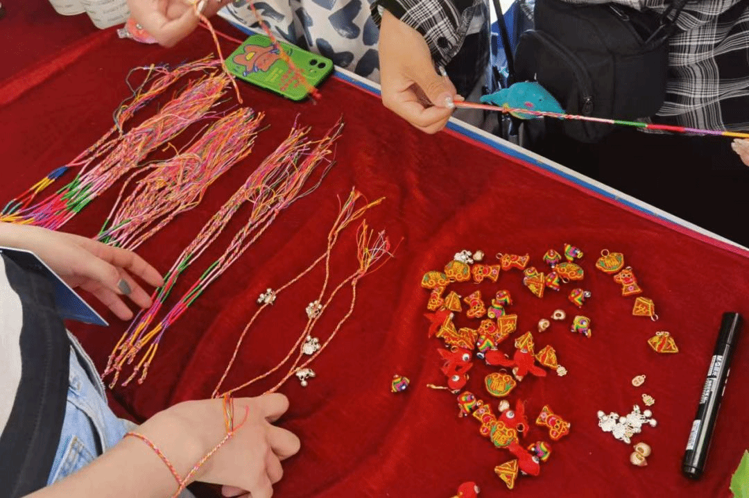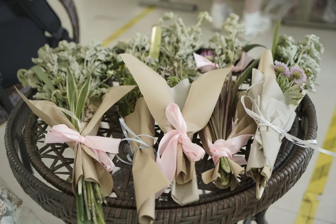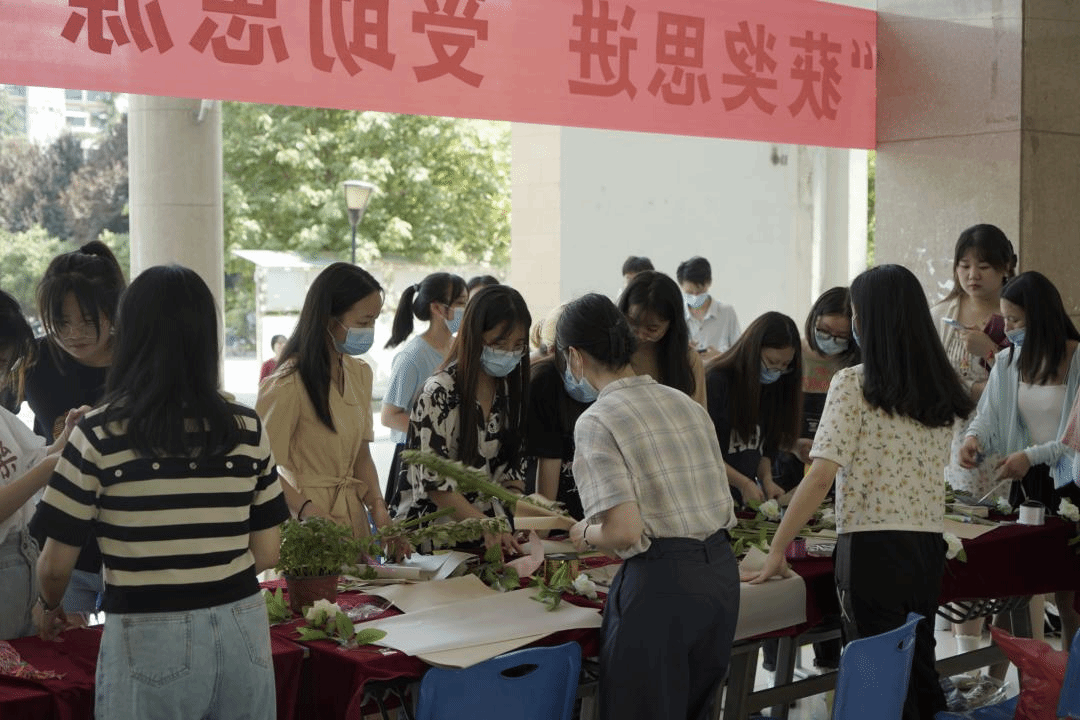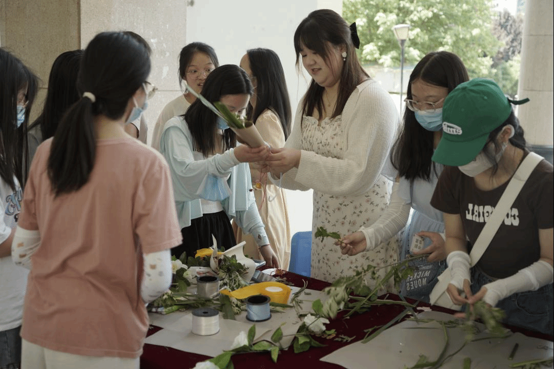 活动现场为大家提供已经编织完成的五彩绳,同学们只需加以装饰即可领走。自制艾草花束处为大家准备了艾草、菖蒲、薄荷、小雏菊等花草以及工具,在场志愿者也为参与的同学提供技术指导。最后,做好的花束将以学院名义赠送给各位老师悬挂于门上。