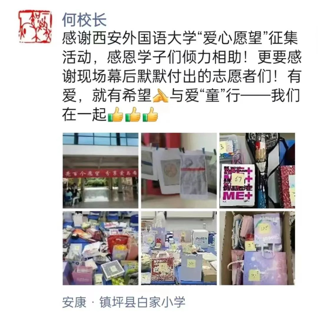本次“一百个心愿”活动共征集了100余名学生的心愿,所有心愿被全部认领。我校师生共计150余人捐赠了爱心物品并写下寄语卡。西外人用自己的行动给白家小学的儿童送去了温暖与祝福。