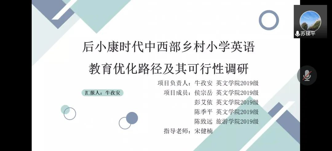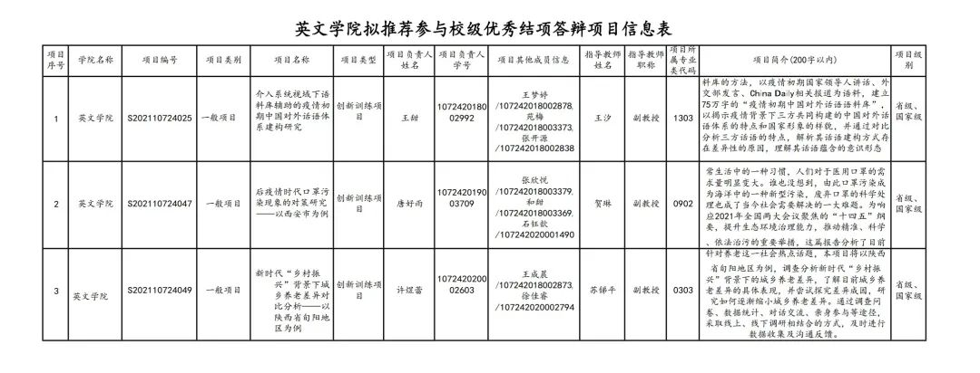 经各项目负责人自主申请、项目团队答辩、学院项目工作小组评估及审议,拟推荐3个项目参与校级优秀结项答辩,分别是“介入系统视域下语料库辅助的疫情初期中国对外话语体系建构研究”项目、“后疫情时代口罩污染现象的对策研究——以西安市为例”项目以及“新时代‘乡村振兴’背景下城乡养老差异对比分析—— 以陕西省旬阳地区为例”项目。