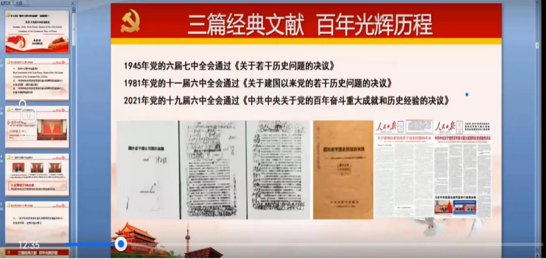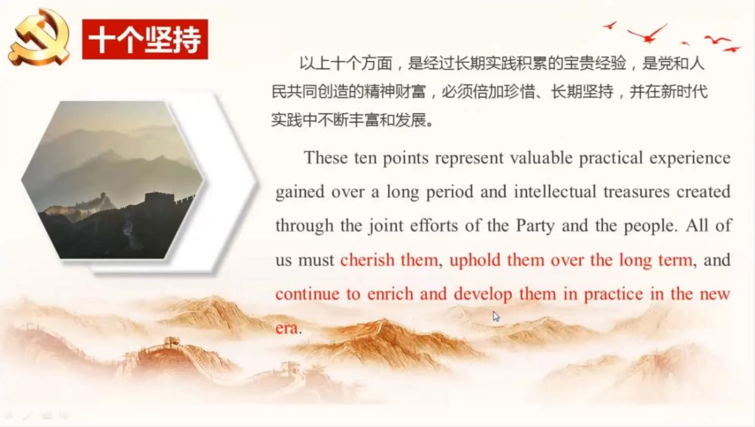 党委结合英语专业特色,将时政热点与双语党课相结合,于5月中下旬举办了第五期“学习贯彻党的十九届六中全会精神”中英双语党课。本期党课采用线上教学方式,共分为“党的十九届六中全会综述”“党的百年奋斗重大成就”“党的百年奋斗历史经验”“党的百年奋斗历史意义和新时代中国共产党”四讲,每场均有300名余名学生党员参加。