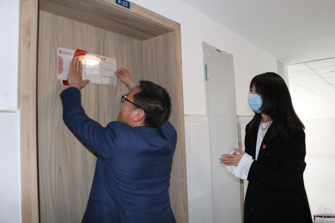 于2022年4月20日下午在7号学生公寓举办“亮党员身份,树先锋旗帜”主题党日活动暨学生党员宿舍挂牌仪式。党委书记单升军、党委副书记马文静、党务秘书、学生党支部书记、党员代表以及挂牌宿舍学生代表参加仪式。仪式由马文静主持。