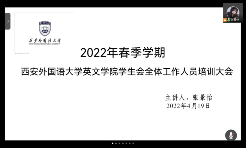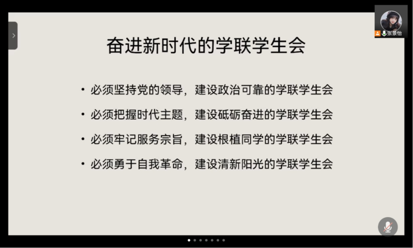 接着,轮值主席张景怡对2022春季学期的重点工作任务进行通报:以迎接和学习宣传贯彻党的二十大为主线,奋进新时代的学联学生会。
