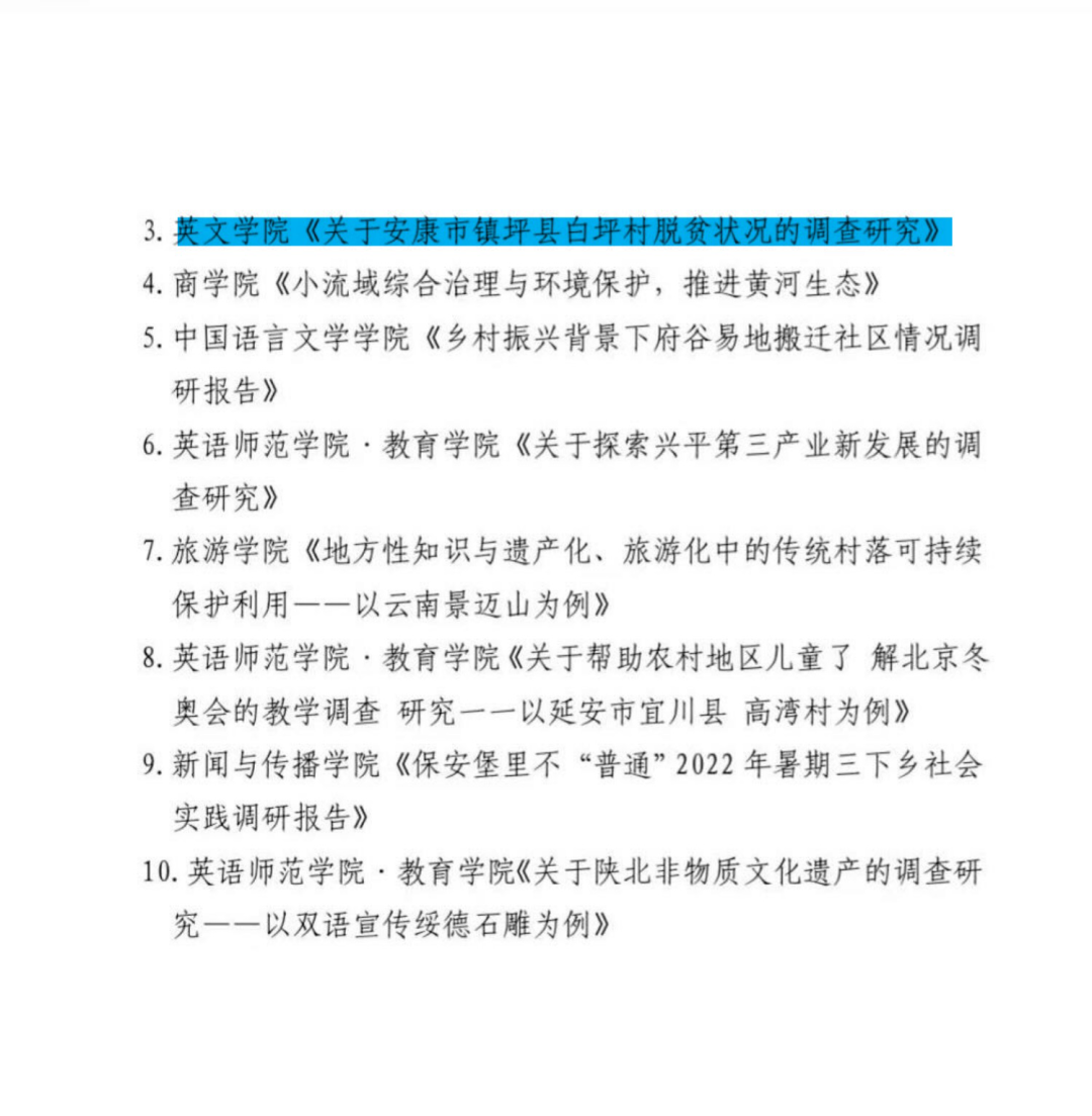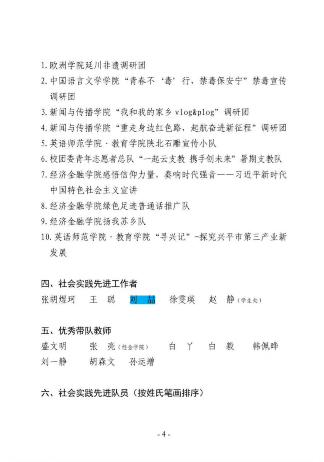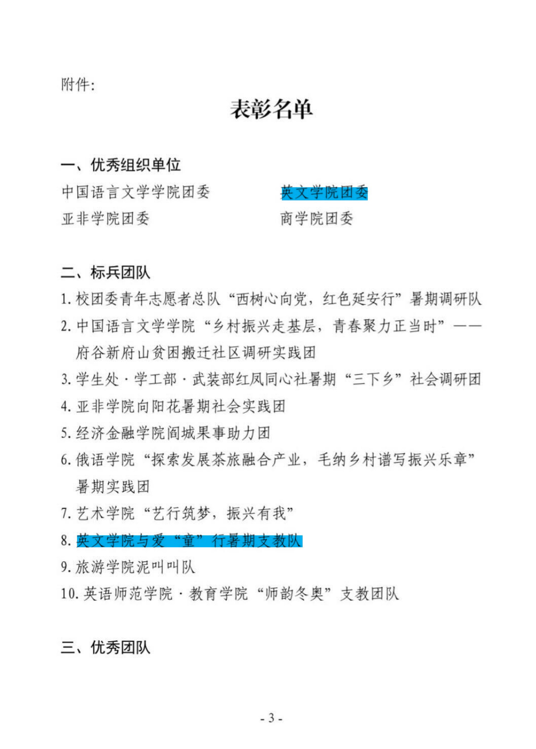 团委荣获“优秀组织单位”,与爱“童”行暑期支教队荣获“标兵团队”,辅导员刘喆荣获“社会实践先进工作者”,学生宁伟业、苑苏、曹博华荣获“社会实践优秀队员”,《关于安康市镇坪县白坪村脱贫状况的调查研究》荣获“优秀调研报告”。再次表示热烈祝贺。