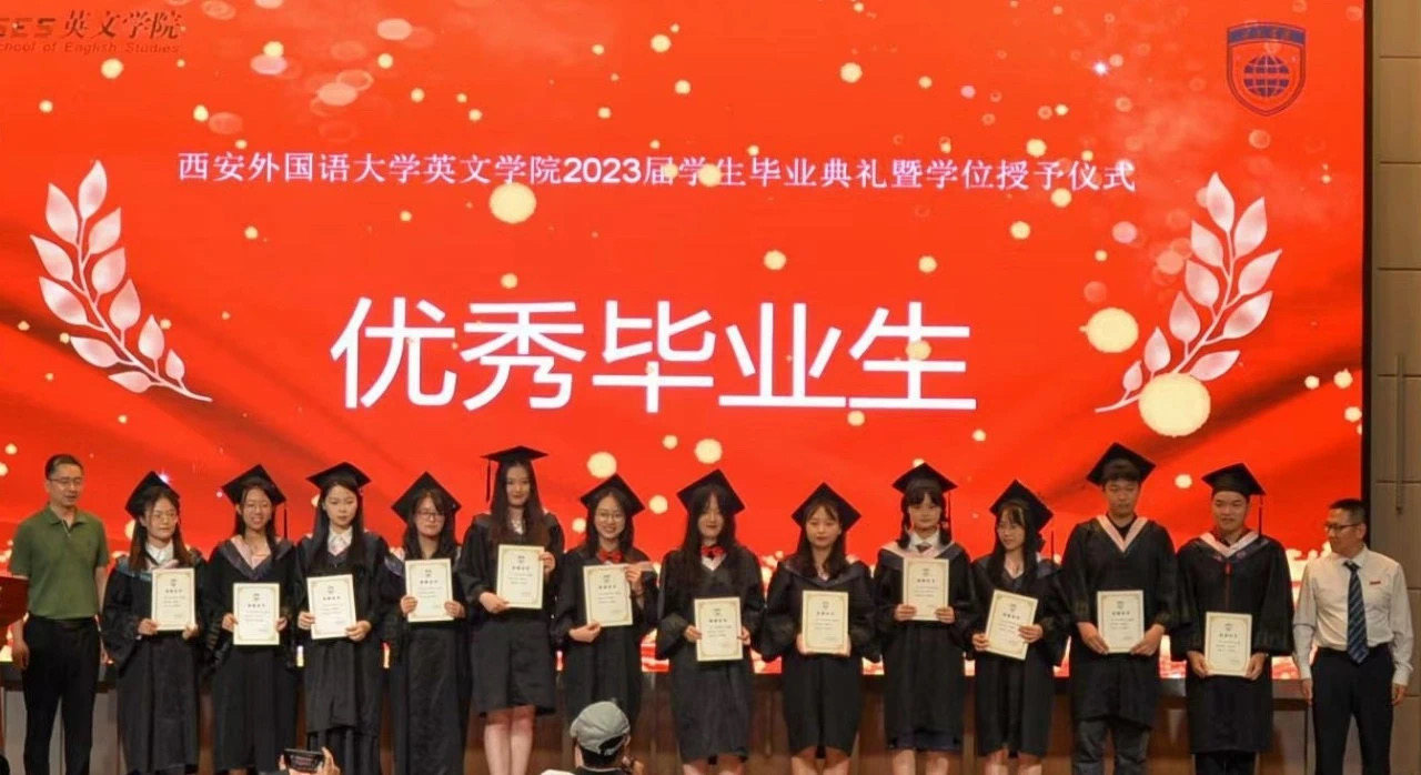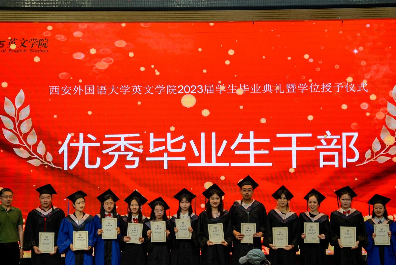 副院长裴等华宣读了《关于表彰2023届优秀毕业生和优秀毕业生干部的通报》,并激励他们不忘初心、踔厉奋发,为中国式现代化贡献西外力量。党委书记单升军、副院长徐斌分别为优秀毕业生和优秀毕业生干部颁发了荣誉证书。