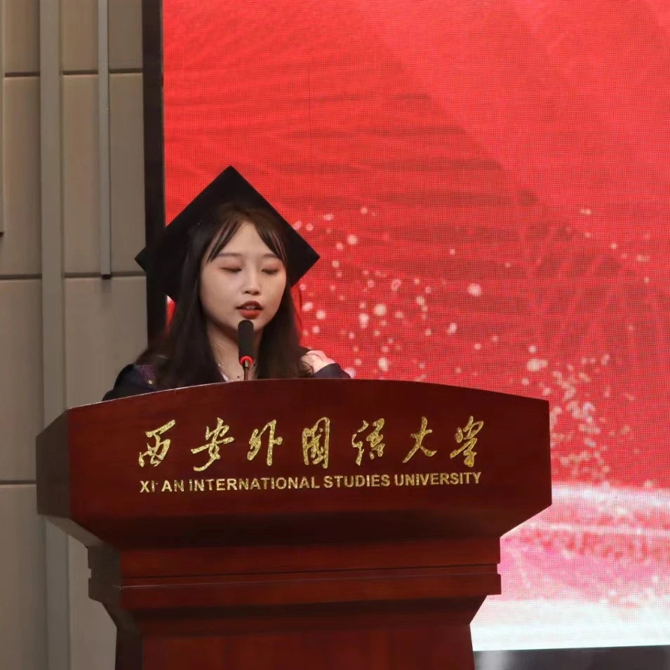 优秀毕业生代表王玟珺和优秀毕业生干部代表张星钰依次进行发言。作为2023届毕业生,她们都满怀感慨地回忆了难忘的校园生活,分享了在西外生活学习的“酸甜苦辣”。同时,号召同学们常怀感恩之心,感恩父母、感恩老师、感恩母校朋友、感谢家人。两位同学还号召全体毕业生勇担责任,在跨文化交流中讲好中国故事,并表达了对母校美好的祝愿。