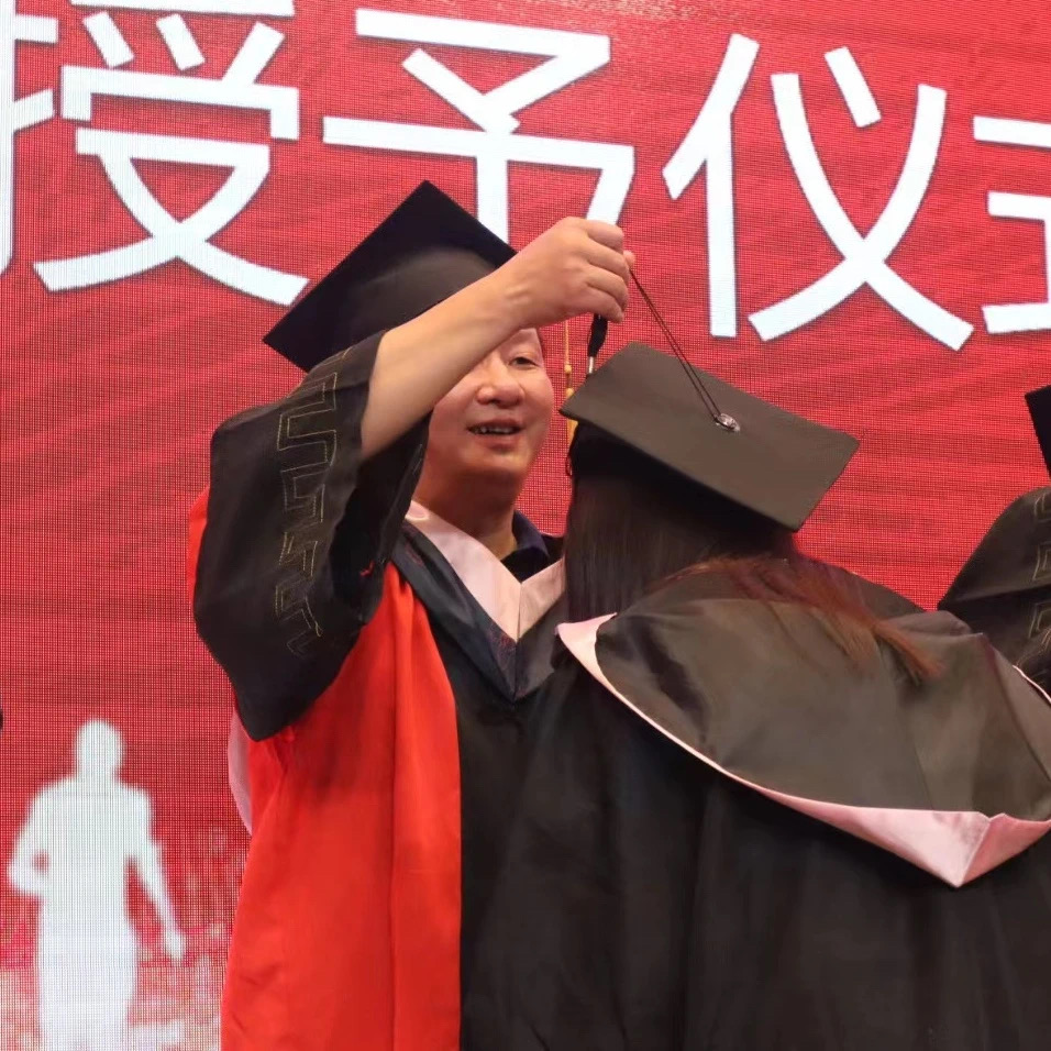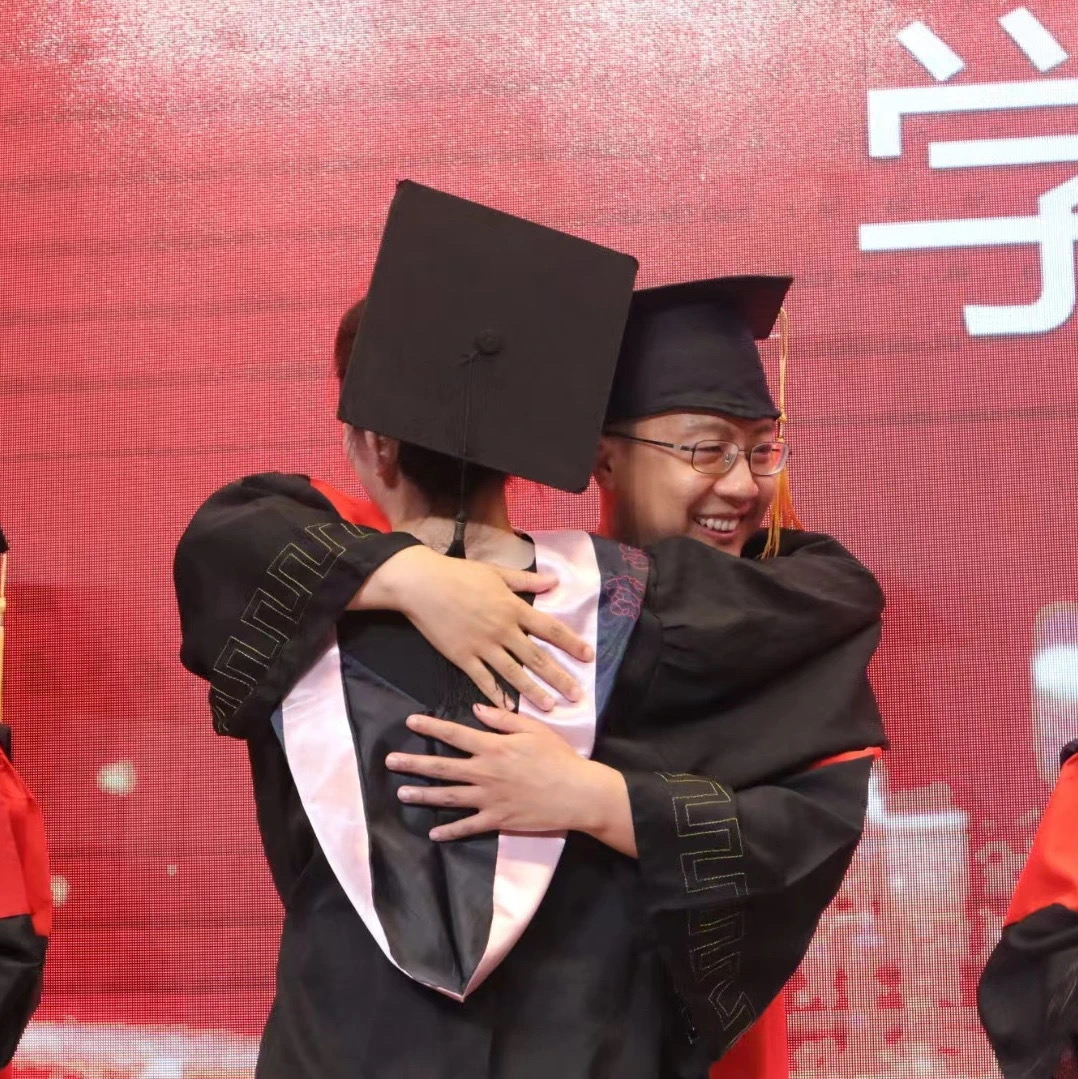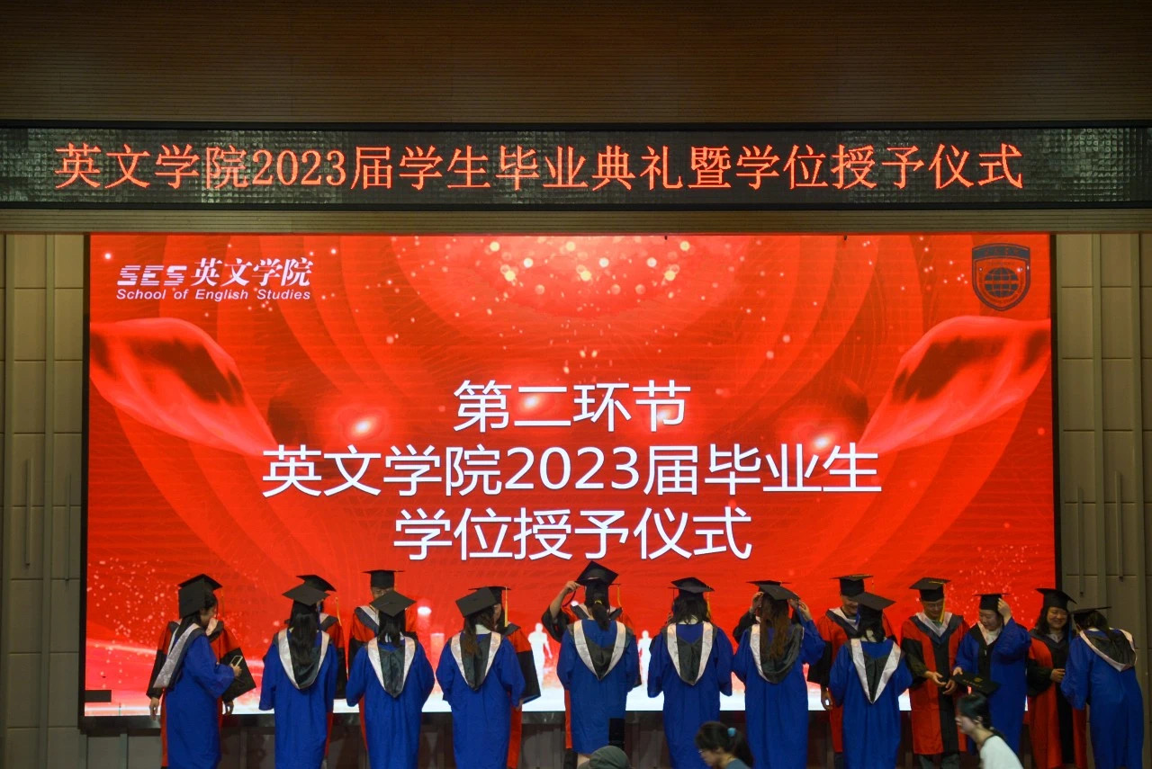 典礼最后一项,进行了2023 届毕业生学位授予仪式。学术委员会的十位老师上台为毕业生拨正流苏,颁发学位证,并合影留念。