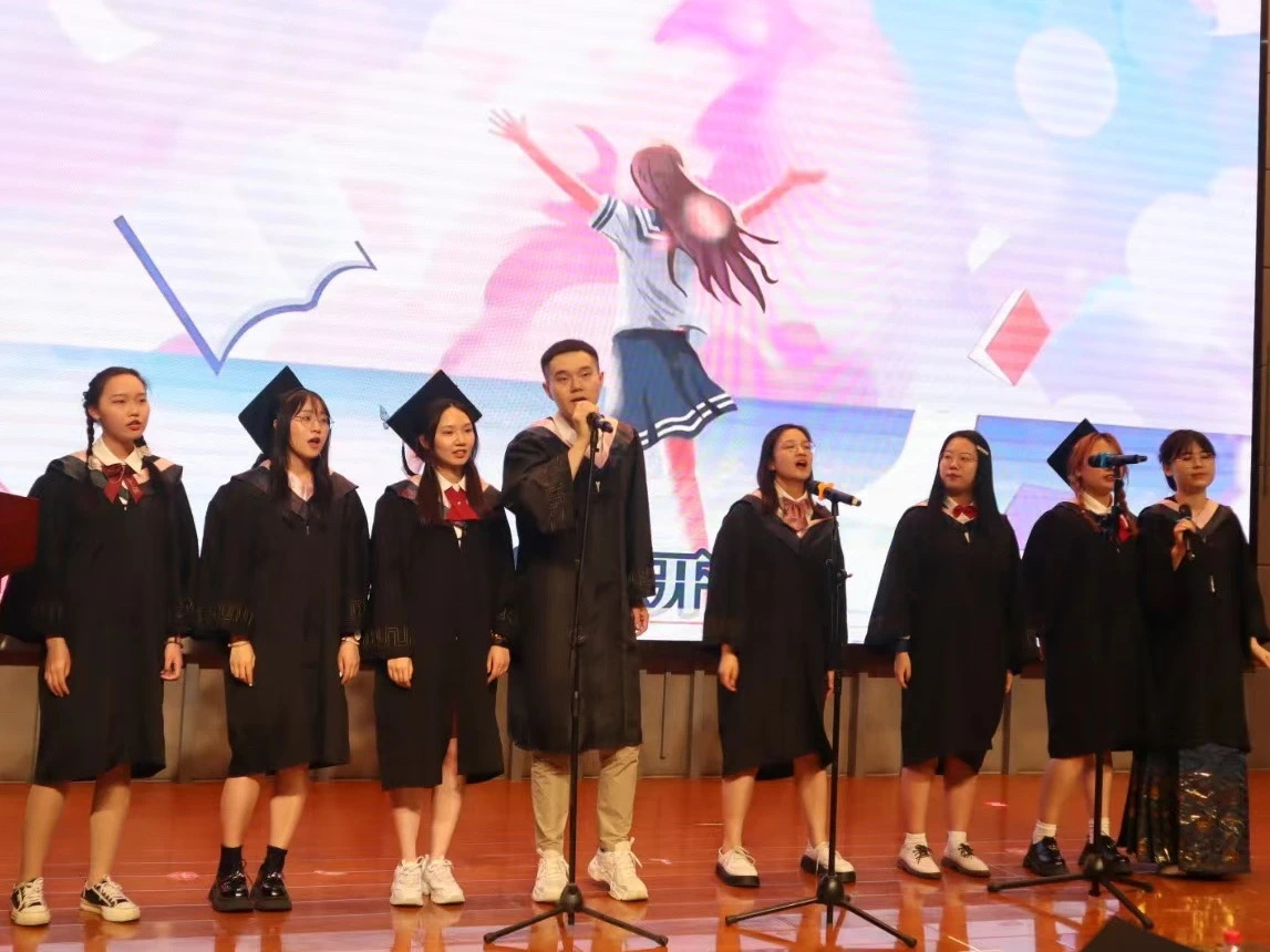 紧接着是合唱节目《凤凰花开的路口》。悠扬的旋律笼罩着会场,八名毕业生来到台上,与台下的同学们共同歌唱。分别,亦是启航,英文学子们一同挥舞着双手,珍惜此时。