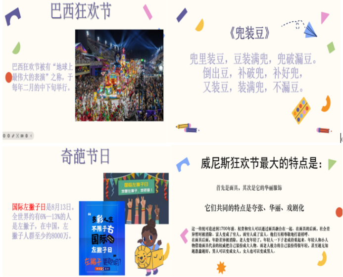 中低年级二组的老师带领同学们将目光投向更广泛的国际性节日中,除了同学们耳熟能详的和国际劳动节和国际儿童节之外,还介绍了不少新颖奇特的节日,例如国际母语日、国际海豹日、国际幸福日……老师们简单的从节日们的时间、庆祝方式以及目的来介绍了这些有趣的国际节日,更好的为孩子们保留了这些节日的神秘感,同时也培养了学生们的国际视野与跨文化理解能力,探讨国际节日背后的共同特点与文化内涵。