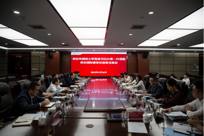 会上,杨祎介绍了西安国际港务区整体情况,国际港务区是陕西省、西安市为打造内陆改革开放新高地设立的经济先导区,是陕西自贸区的核心板块,是西安国家中心城市建设的东部新中心和第十四届全运会主场馆所在地。白黎介绍了学校基本情况以及学校人才培养、学科设置和学生就业情况,他谈到,西安国际港务区是省市响应国家“一带一路”倡议、打造丝绸之路经济带新起点、建设对外开放大通道的重要抓手和主要平台,发展态势、需求同学校专业设置方向、人才培养目标有较高的契合度,双方要把握发展新机遇,深入挖掘合作潜力,不断强化战略合作,他表示,港务区的超前发展理念、较高发展速度、良好干部作风都值得学校借鉴学习。魏玮介绍园区电商产业及整体人才需求情况。双方还就在我校举办国际港务区所属企业专场招聘会、搭建常态化联系沟通平台进行了商讨。