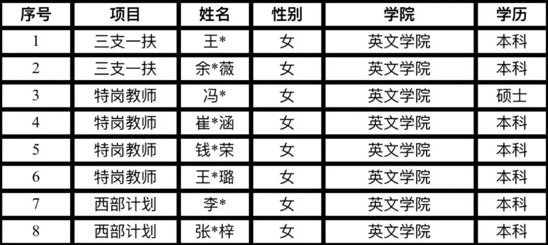 进一步强化学生思想引领,厚植学生家国情怀,大力宣传艰苦边远地区基层就业政策办法,在学校奖励的基础上制定学院基层就业激励奖励办法,多次开展“特岗教师”“三支一扶”“选调生”“西部计划”等大学毕业生基层就业项目的精准动员、精准宣讲工作。同学们怀揣梦想、志存高远、响应号召、踊跃报名,最终8名优秀毕业生通过不同项目的招募选聘、考察考核等程序,顺利踏上征程,赴基层一线人民最需要的地方贡献青春力量。